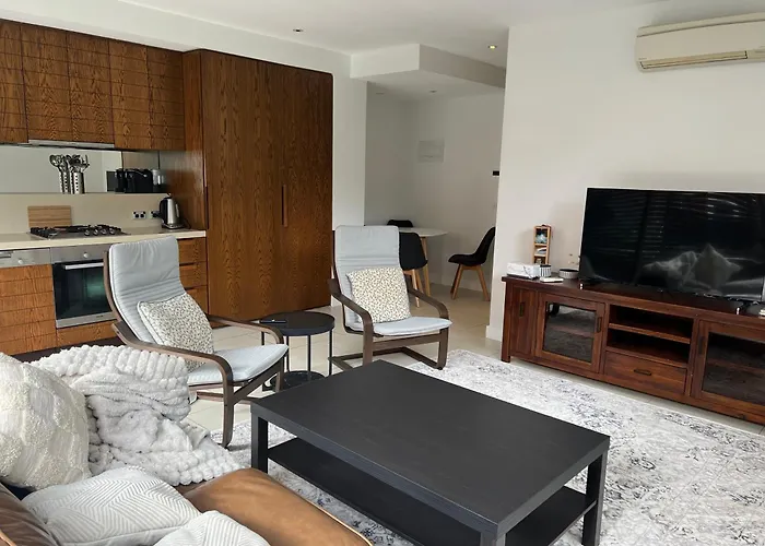 この2のベッドル-ムのあるアパ-トメントには器具でいっぱいの台所と2のバスル-ムがあります.